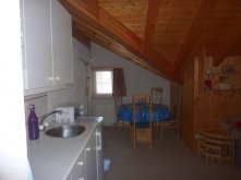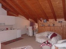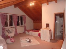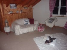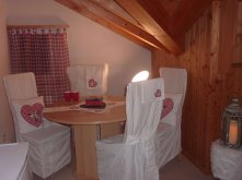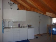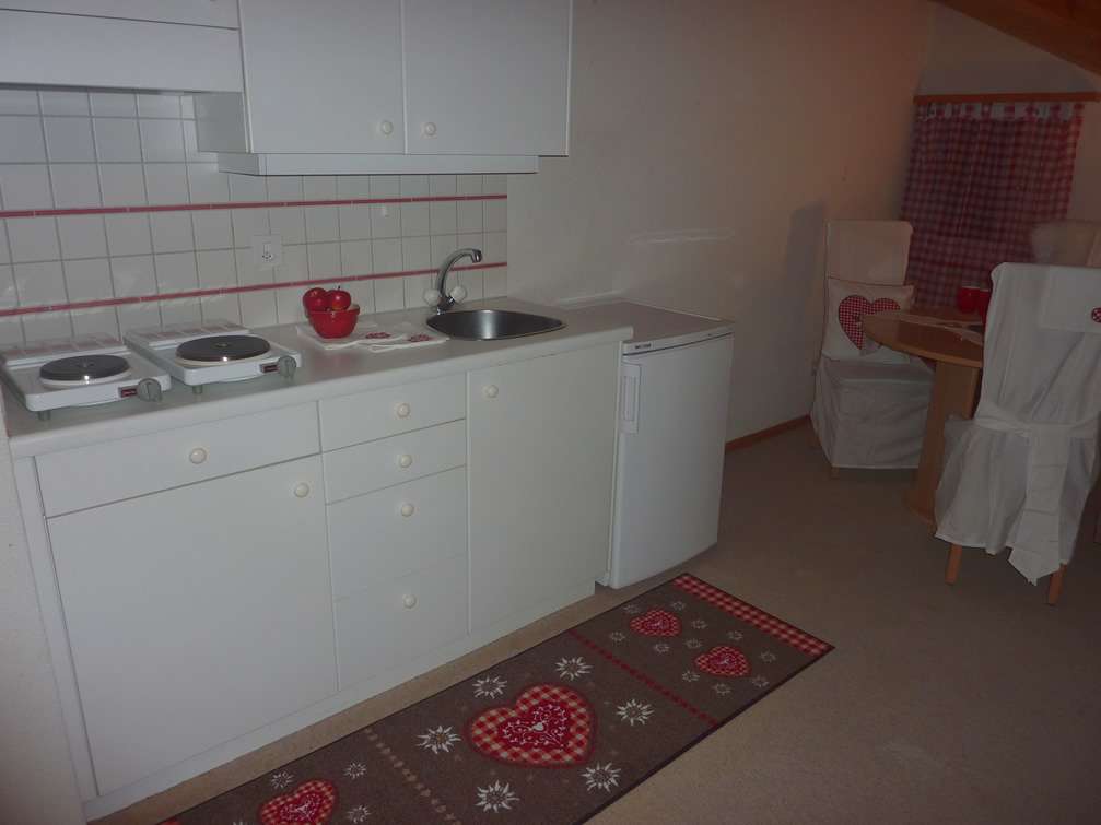 Der rote Fries in der Küche ist Grundlage für das verwendete Farbschema. Unser liebevoller "Alpenkitsch" bringt den nötigen Kuschelfaktor für ein unbeschwertes Ferienfeeling